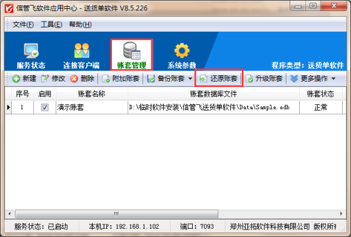 把備份數(shù)據(jù).dbk格式的文件復(fù)制到電腦桌面上,方便還原賬套進(jìn)行選擇。打開(kāi)應(yīng)用中心程序(紅色圖標(biāo)),在賬套管理中點(diǎn)擊賬套文件(如沒(méi)有賬套可以新建一個(gè)新的賬套),點(diǎn)擊工具欄的“還原賬套”如下圖1所示: