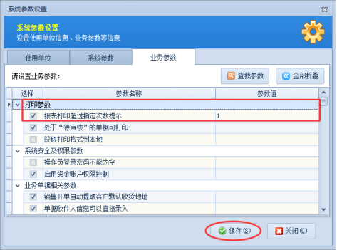 以信管飛送貨單軟件為例,示范下如何設(shè)置操作員不能超過指定的打印次數(shù)權(quán)限。首先,設(shè)置下系統(tǒng)報表打印次數(shù)提示,在功能導(dǎo)航窗點(diǎn)擊“系統(tǒng)管理”—》“系統(tǒng)參數(shù)配置”—》“業(yè)務(wù)參數(shù)”,在業(yè)務(wù)參數(shù)中將“報表打印超過指定次數(shù)提示”勾選上,并設(shè)置打印次數(shù),系統(tǒng)默認(rèn)打印次數(shù)為1,可根據(jù)自己實(shí)際需求設(shè)置。設(shè)置完成后點(diǎn)擊保存,如下圖1所示: