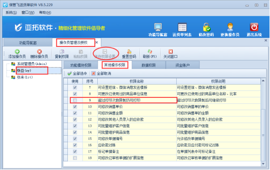 在功能導(dǎo)航窗點(diǎn)擊“系統(tǒng)管理”—》“操作員及授權(quán)”進(jìn)入操作員管理及授權(quán)界面,選擇操作員“張亞”(系統(tǒng)管理員默認(rèn)具有所有權(quán)限),在右側(cè)功能權(quán)限選擇“其他操作權(quán)限”,把此界面下的權(quán)限“超過打印次數(shù)限制仍可打印”取消勾選,保存權(quán)限設(shè)置,如下圖2所示: