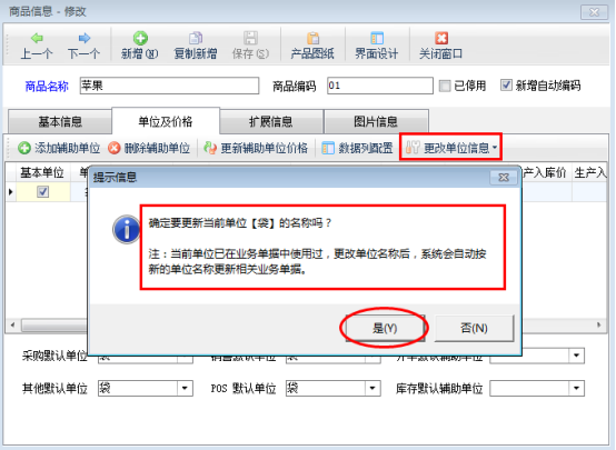 修改單位名稱,會(huì)自動(dòng)更新之前的開過的單據(jù)的商品基本單位。