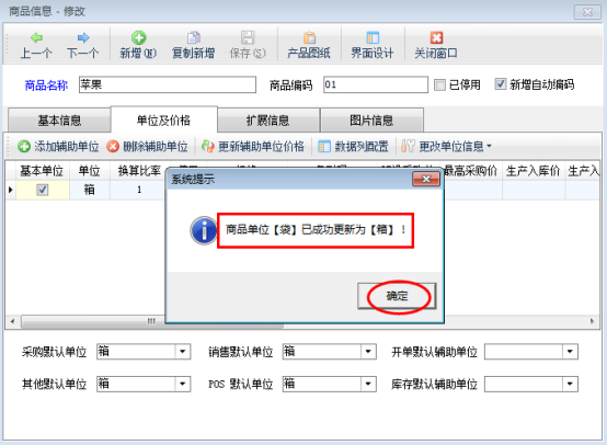 在圖3中,點(diǎn)擊“是”按鈕可以進(jìn)行修改單位名稱,示例中是把單位“袋”修改為“箱”,修改后顯示為: