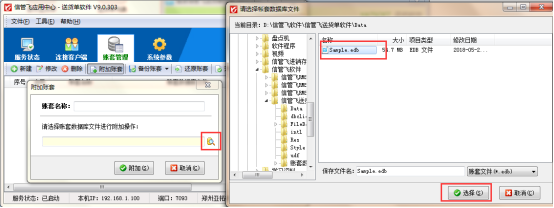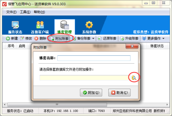 以信管飛送貨單軟件為例。示范下如何附加賬套?打開紅色的應(yīng)用中心程序,選擇賬套管理界面,點(diǎn)擊工具欄中的“附加賬套”,點(diǎn)擊后會(huì)彈出附加賬套窗口,如下圖1所示: