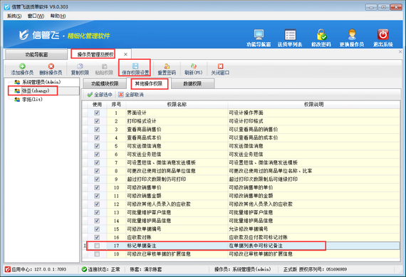 信管飛送貨單軟件支持對訂單列表、送貨單列表以及退貨單列表標記備注。如果不允許操作員標記單據備注,可以對操作員取消“標記單據備注”的權限。下面我們介紹一下在信管飛送貨單軟件中設置操作員不可標記單據備注的操作步驟。