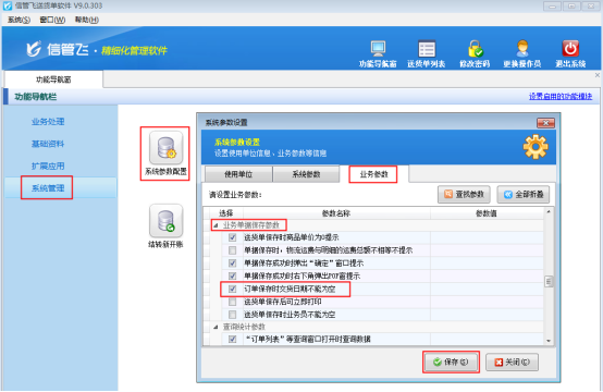 信管飛RMS(進(jìn)銷存記賬軟件)、信管飛倉庫管理軟件、信管飛送貨單軟件等都可以設(shè)置訂單保存時(shí)交貨日期不能為空,本篇文章以信管飛送貨單軟件為例介紹一下如何設(shè)置訂單保存時(shí)交貨日期不能為空。通過“系統(tǒng)管理”——》“系統(tǒng)參數(shù)配置”——》“業(yè)務(wù)參數(shù)”可以進(jìn)入“業(yè)務(wù)參數(shù)”配置界面,在業(yè)務(wù)單據(jù)保存參數(shù)內(nèi)打勾啟用“訂單保存時(shí)交貨日期不能為空”參數(shù),如下圖1所示。