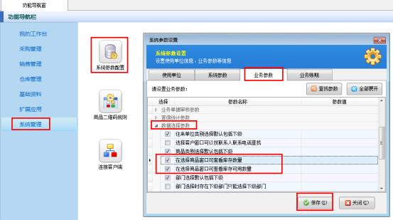在功能導(dǎo)航窗,點(diǎn)擊“系統(tǒng)管理”—》“系統(tǒng)參數(shù)配置”—》“業(yè)務(wù)參數(shù)”,選擇“數(shù)據(jù)選擇參數(shù)”進(jìn)行設(shè)置,勾選參數(shù)“在選擇商品窗口可查看庫(kù)存數(shù)量”及“在選擇商品窗口可查看庫(kù)存可用數(shù)量”,然后保存,如圖1所示。