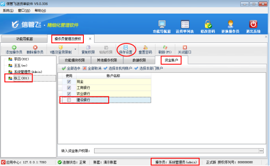 信管飛送貨單軟件、信管飛RMS、信管飛出納記賬軟件都支持設(shè)置資金賬戶的控制權(quán)限,本文以送貨單軟件為例,介紹一下如何控制操作員的資金賬戶權(quán)限?