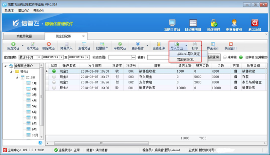 出納記賬軟件中可以直接根據資金賬戶新增新增現金日記賬和銀行日記賬,以現金日記賬為例,示范如何導出為Excel文件。軟件也支持通過Excel文件導入日記賬憑證信息。如下圖所示: