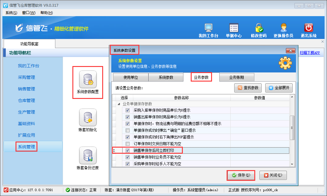 在功能導(dǎo)航窗點(diǎn)擊“系統(tǒng)管理”——》“系統(tǒng)參數(shù)配置”打開系統(tǒng)參數(shù)配置界面,在業(yè)務(wù)單據(jù)保存參數(shù)中打勾選中“銷售單保存后可立即打印”參數(shù),然后點(diǎn)擊“保存”按鈕保存設(shè)置即可,如下圖所示。