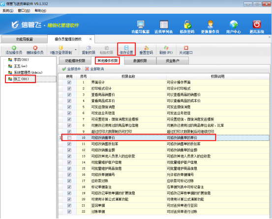 在功能導航窗選擇“系統管理”—》“操作員及授權”,進入操作員管理及授權界面,以操作員“張三”為例,選擇操作員后,點擊“其他操作權限”,取消勾選“可修改銷售單價”,然后保存設置,如圖1所示。
