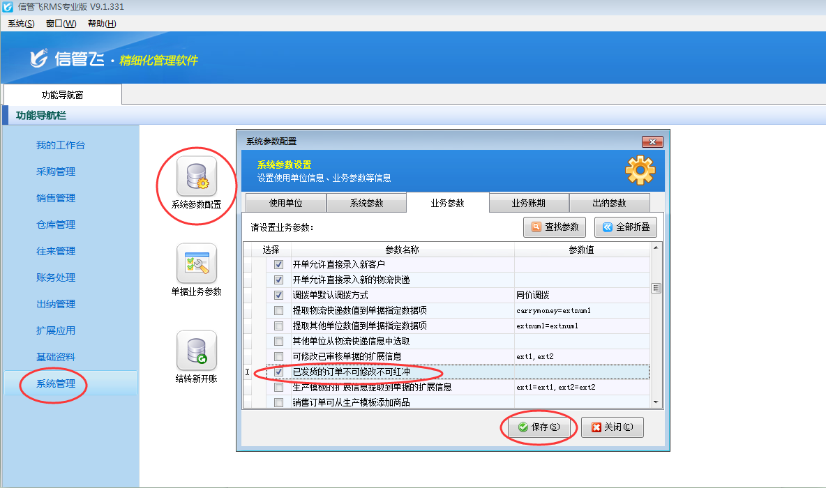 在功能導(dǎo)航窗點(diǎn)擊“系統(tǒng)管理”→“系統(tǒng)參數(shù)設(shè)置”→“業(yè)務(wù)參數(shù)”可以打開“業(yè)務(wù)參數(shù)”配置界面,在業(yè)務(wù)單據(jù)相關(guān)參數(shù)內(nèi)打鉤啟用“已發(fā)貨的訂單不可修改不可紅沖”參數(shù),然后點(diǎn)擊“保存”按鈕保存設(shè)置,如下圖1所示。