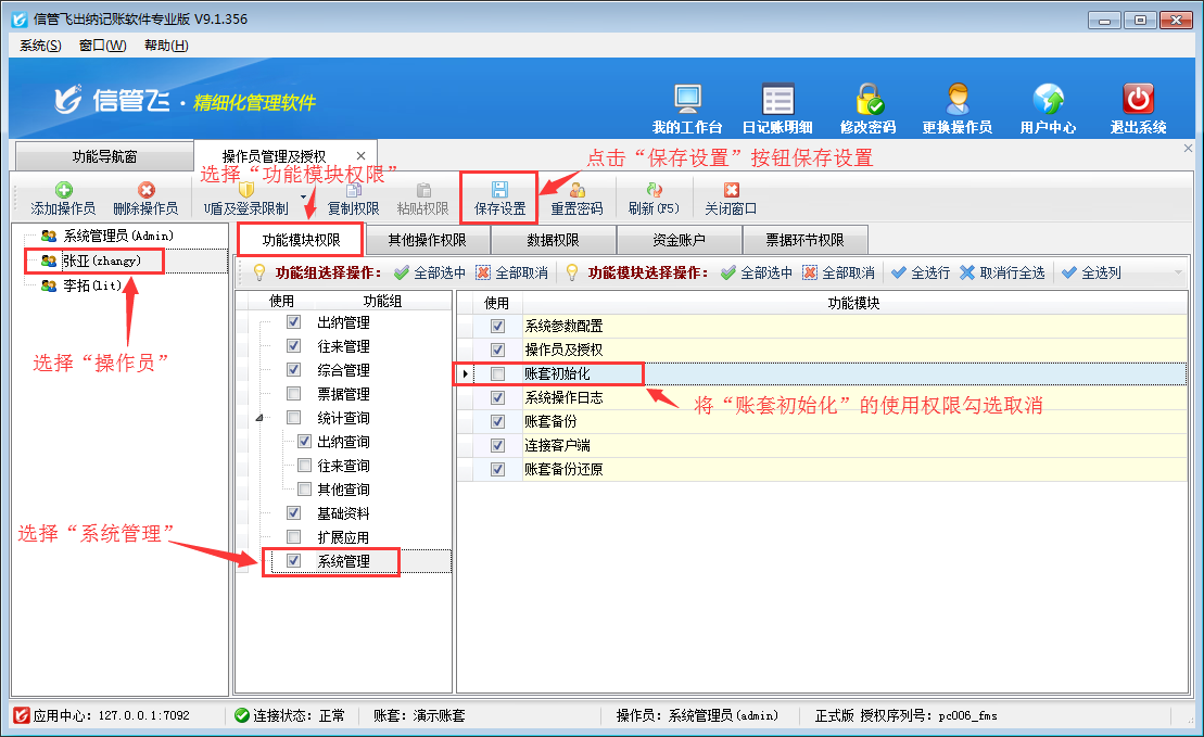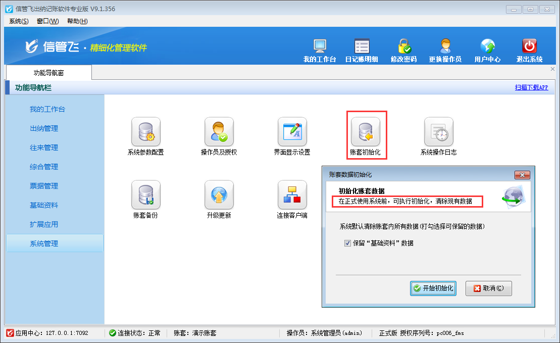 執(zhí)行賬套初始化操作后,會(huì)刪除賬套內(nèi)相應(yīng)的數(shù)據(jù),因此務(wù)必提前做好備份,謹(jǐn)慎操作!為了避免操作員誤操作,導(dǎo)致數(shù)據(jù)丟失,軟件內(nèi)支持設(shè)置操作員不可進(jìn)行賬套初始化操作,下面以信管飛出納記賬軟件專業(yè)版為例來演示一下具體的操作步驟。