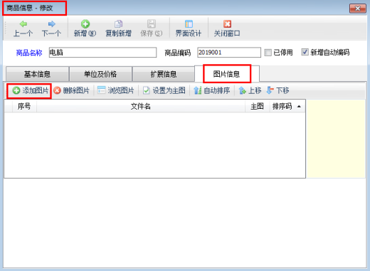 在功能導航窗點“基礎資料”—》“商品信息”即可進入“商品信息”界面,對商品進行新增或修改時可以編輯商品信息、上傳商品圖片信息。以商品“電腦”為例,對商品進行修改,系統彈出“商品信息修改”窗口,點擊“圖片信息”頁面,如圖1所示。
