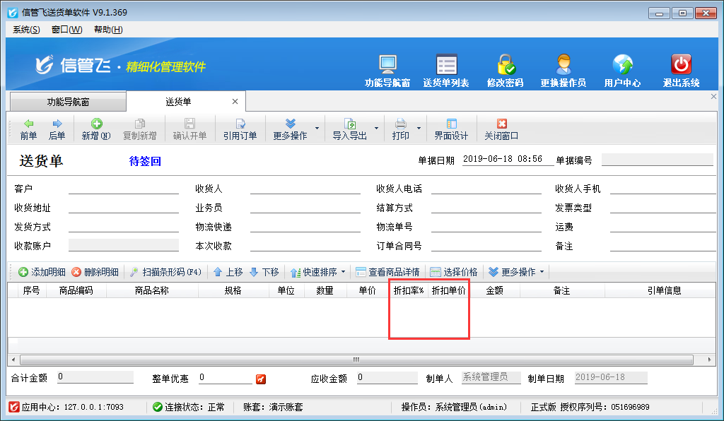 以送貨單軟件為例,新開送貨單界面默認顯示折扣率%和折扣單價數(shù)據(jù)項(如下圖所示),部分用戶在開單時不需要顯示折扣率%、折扣單價,會咨詢客服如何去掉這兩項。本文詳細介紹一下如何設置新開送貨單界面不顯示折扣率%和折扣單價?