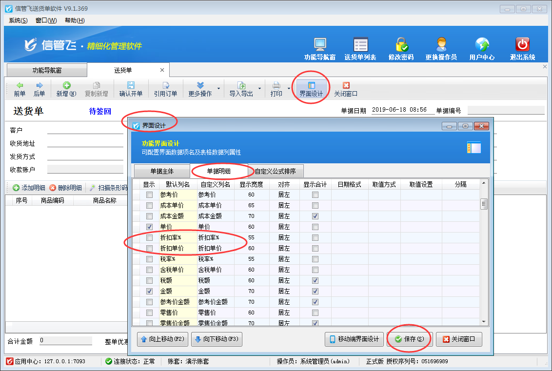 在送貨單界面工具欄點擊“界面設計”按鈕,打開界面設計窗口,選擇單據(jù)明細,找到“折扣率%”和“折扣單價”數(shù)據(jù)項,將“顯示”勾選取消并保存配置即可。