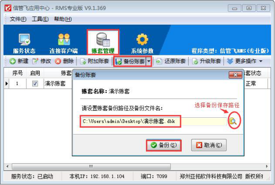 備份是在電腦的紅色應(yīng)用中心程序(應(yīng)用中心程序打開會在電腦桌面右下角顯示)上操作,打開紅色應(yīng)用中心程序,點擊“賬套管理”界面,選擇需要備份的賬套,點擊工具欄“備份賬套”,可以選擇備份的保存路徑,為了方便復(fù)制備份數(shù)據(jù),可以把備份文件保存在電腦桌面上,如下圖所示: