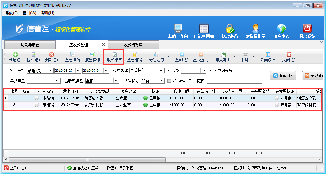 注意:收款結算單單據明細中“本次結銷金額”的合計金額,必須等于可結銷金額(收款金額 + 優惠金額),否則無法保存收款結算單。