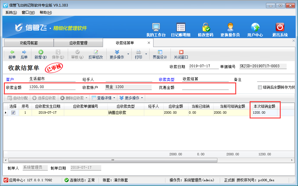 在應(yīng)收款管理界面點擊“收款結(jié)算”按鈕可以打開收款結(jié)算單對應(yīng)收款進(jìn)行收款結(jié)算,如下圖所示,在收款結(jié)算單單據(jù)主體選擇收款賬戶后錄入“收款金額”1200元,單據(jù)明細(xì)中“本次結(jié)銷金額”錄入1200元,保存并審核收款結(jié)算單即可。