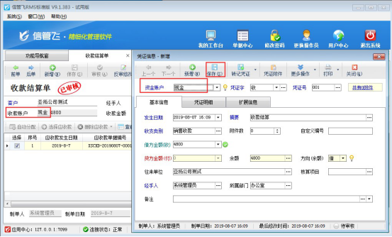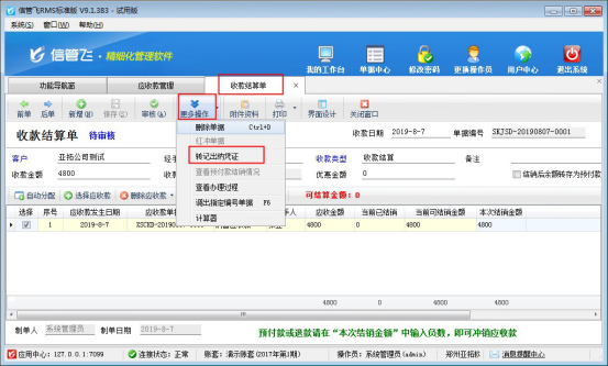 信管飛RMS標(biāo)準(zhǔn)版和專(zhuān)業(yè)版中增加了出納模塊,可以登記現(xiàn)金銀行日記賬。信管飛RMS 軟件中用戶(hù)在做收款結(jié)算后如需要把這筆賬管理到日記賬中,可以在收款時(shí)轉(zhuǎn)記到出納日記賬中。在軟件中如何操作呢?
