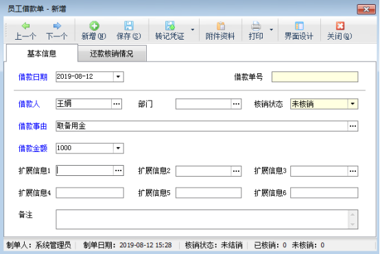 查看詳情:在借款單列表中,選擇一個借款單,點擊工具欄中的“查看詳情”銨鈕,彈出“借款單信息”窗口。可查看借款情況和核銷情況。