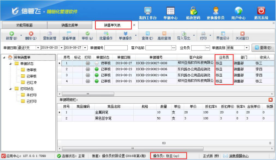 保存銷售出庫單后,在銷售管理—》銷售單列表查看已保存的銷售出庫單,只能看到業務員為“張亞”的單據,其他操作員的無法查看到。如下圖所示: