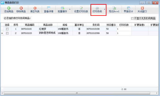 移除商品:在工具欄點擊“移除商品”按鈕,可以移除已添加到待打印商品列表內的無需打印條形碼的商品。