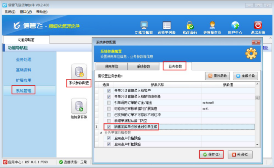 在功能導(dǎo)航窗選擇“系統(tǒng)管理”—》“系統(tǒng)參數(shù)配置”在業(yè)務(wù)參數(shù)的“業(yè)務(wù)單據(jù)相關(guān)參數(shù)”中勾選啟用參數(shù)“銷售出庫(kù)單必須通過(guò)引單生成”,保存參數(shù)配置,如下圖所示: