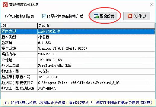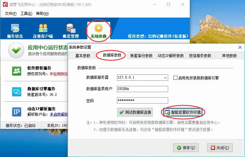 在軟件應(yīng)用中心程序中,點(diǎn)擊“系統(tǒng)參數(shù)”->“數(shù)據(jù)庫(kù)參數(shù)”打開數(shù)據(jù)庫(kù)參數(shù)配置界面,然后點(diǎn)擊“智能修復(fù)軟件環(huán)境”按鈕打開智能修復(fù)軟件環(huán)境界面智能修復(fù)軟件環(huán)境即可,如下圖所示(或者在軟件應(yīng)用中心程序中點(diǎn)菜單“工具”->“智能修復(fù)軟件環(huán)境”同樣可以打開智能修復(fù)軟件環(huán)境界面智能修復(fù)軟件環(huán)境)。