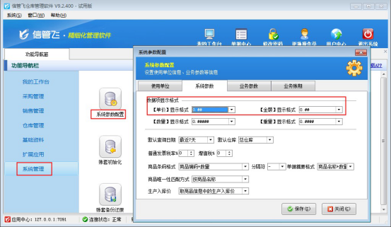 為滿足更多用戶可根據(jù)自身業(yè)務(wù)特點(diǎn)進(jìn)行設(shè)置數(shù)據(jù)格式顯示的需求,信管飛倉(cāng)庫(kù)管理軟件、信管飛送貨單軟件等支持?jǐn)?shù)據(jù)項(xiàng)顯示格式的設(shè)置,以“信管飛倉(cāng)庫(kù)管理軟件”為例,示范如何設(shè)置。登錄軟件,在功能導(dǎo)航窗點(diǎn)“系統(tǒng)管理”—》“系統(tǒng)參數(shù)設(shè)置”即可進(jìn)入“系統(tǒng)參數(shù)設(shè)置”界面,點(diǎn)擊“系統(tǒng)參數(shù)”,如下圖所示: