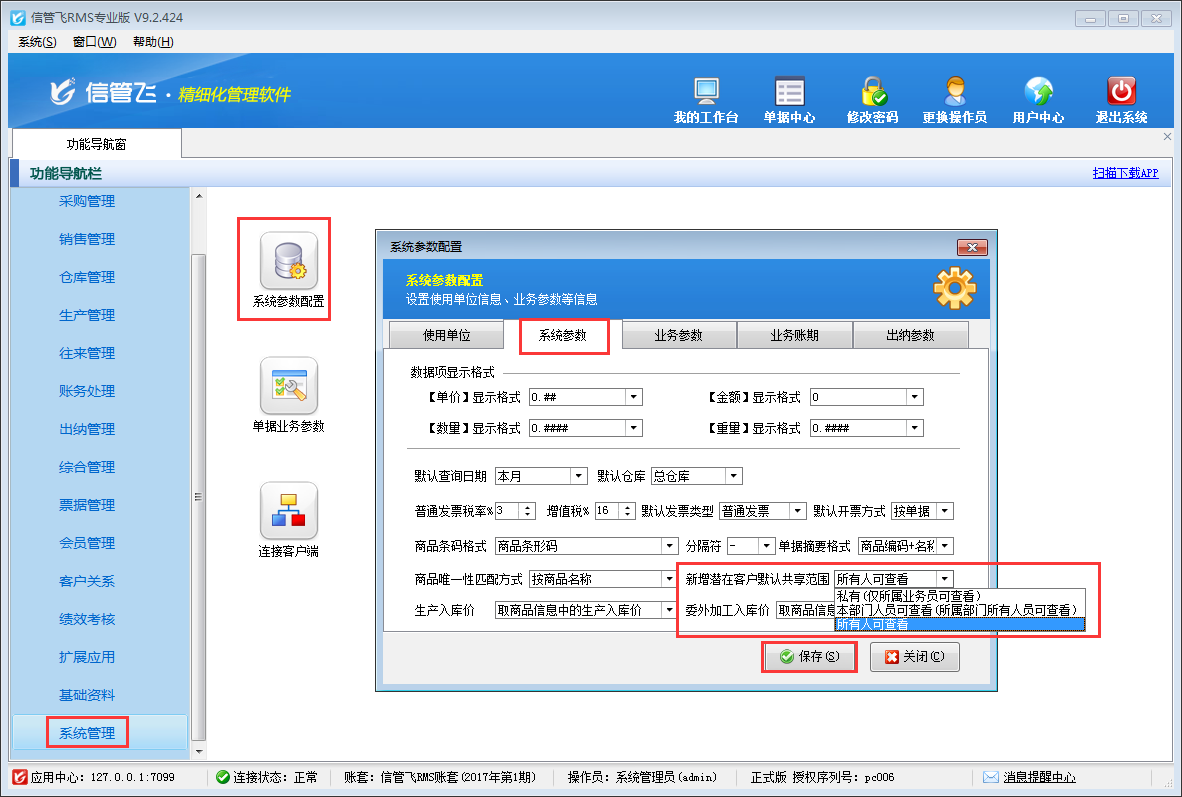 在功能導(dǎo)航窗中點擊“系統(tǒng)管理”—》“系統(tǒng)參數(shù)配置”,即可進(jìn)入“系統(tǒng)參數(shù)設(shè)置”界面,其界面如下圖所示。此處我們把新增潛在客戶默認(rèn)共享范圍設(shè)置為“所有人可查看”,然后點擊“保存”按鈕保存設(shè)置。