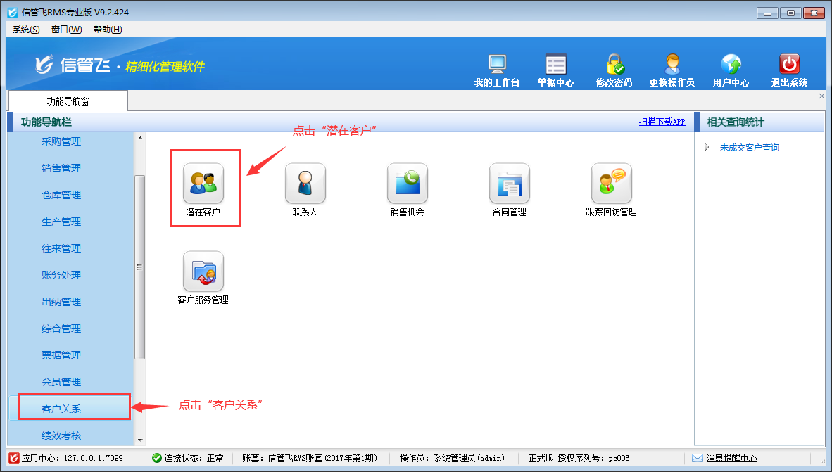 潛在客戶管理屬于客戶關(guān)系模塊,為信管飛RMS(進(jìn)銷存管理軟件)擴(kuò)展模塊,如需使用,是需要另外購買的,可聯(lián)系在線客服進(jìn)行咨詢試用。