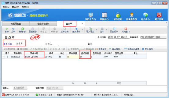 假如實際盤點商品“EPSON LQ-630K”庫存數量為20臺,和軟件中查詢到的庫存數量不一致,需要在軟件中開一個盤點單進行更正庫存數量,在“倉庫管理”中打開“盤點單”,選擇倉庫“主倉庫”,然后選擇商品“EPSON LQ-630K”,輸入盤點數量“20”,然后保存審核盤點單,然后再次查詢庫存,可看到庫存數量已更正為20。如下圖所示:
