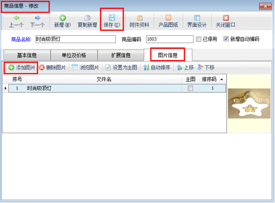 在功能導航窗點“基礎資料”—》“商品信息”即可進入“商品信息”界面,對商品進行新增或修改時可以編輯商品信息、上傳商品圖片信息。如下圖所示: