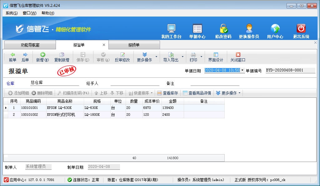信管飛RMS、信管飛倉(cāng)庫(kù)管理軟件都支持使用報(bào)溢單、報(bào)損單進(jìn)行庫(kù)存數(shù)量調(diào)整,下面我們以倉(cāng)庫(kù)管理軟件為例來(lái)演示一下具體的操作步驟。