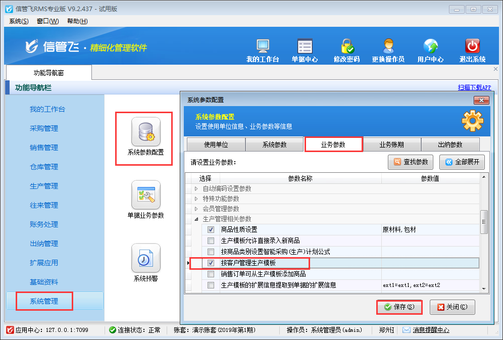 在功能導航窗點擊“系統管理”—》“系統參數配置”—》“業務參數”打開業務參數配置界面,然后在生產管理相關參數中打鉤啟用“按客戶管理生產模板”參數,然后點擊“保存”按鈕保存參數配置,如下圖所示。