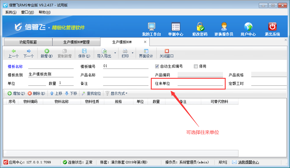 參數配置完成之后,打開生產管理模塊,重新新增生產模板BOM表時,即可選擇往來單位,如下圖所示,在給“亞拓公司測試”、“藍貓文具店”兩家客戶生產同樣的產品“電腦”時設置的不同的生產模板,所需的原材料不同。
