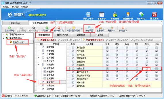 在功能導(dǎo)航窗點擊“系統(tǒng)管理”—》“操作員及授權(quán)”打開操作員管理及授權(quán)界面,選擇操作員“張亞”,在功能模塊權(quán)限界面,選擇“基礎(chǔ)資料”—》“商品信息”,在導(dǎo)出權(quán)限下,把商品信息“導(dǎo)出”權(quán)限勾選取消后保存權(quán)限設(shè)置,如下圖所示: