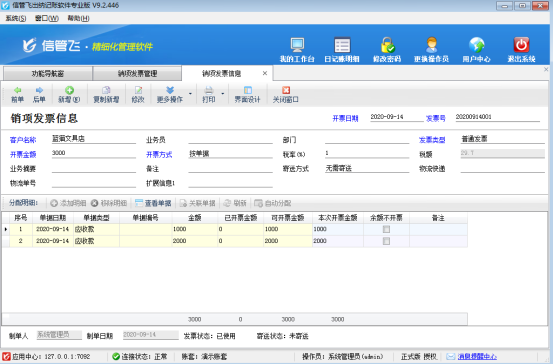 在功能導(dǎo)航窗點“票據(jù)管理”—》“銷項發(fā)票管理”,新增銷項發(fā)票,開票方式選擇“按單據(jù)”,然后點擊“添加明細(xì)”選擇需要開發(fā)票的應(yīng)收款記錄,然后再錄入開票金額及其他信息后保存單據(jù),如圖1所示: