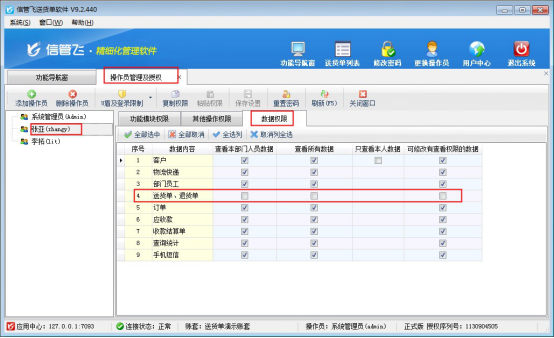 信管飛送貨單軟件支持設置多個操作員登錄軟件,為避免不同操作員登錄軟件查看其他人單據,軟件支持設置操作員權限,只能查看自己的開單單據,以“送貨單”為例,示范下如何設置操作員只能查看自己的單據。