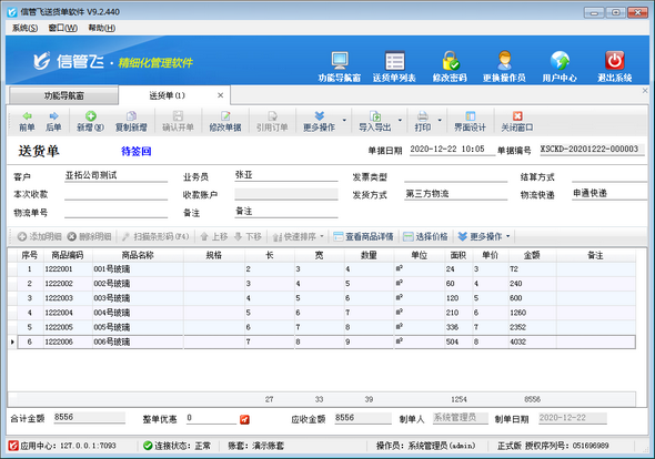 信管飛RMS(進銷存管理軟件)、信管飛送貨單軟件、信管飛倉庫管理軟件等開單默認是根據單價*數量自動計算得出金額,如有其他的數據計算需求,軟件也支持自定義計算公式,本篇文章以送貨單軟件為例介紹一下如何自定義計算公式?