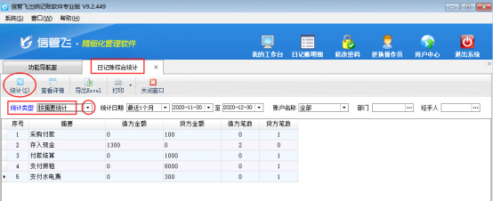 在“日記賬綜合統(tǒng)計”界面,統(tǒng)計類型選擇“按摘要統(tǒng)計”,然后點(diǎn)擊“統(tǒng)計”按鈕,可以根據(jù)摘要進(jìn)行統(tǒng)計。另外,系統(tǒng)支持根據(jù)日期、賬戶名稱、部門、經(jīng)手人等條件進(jìn)行統(tǒng)計查詢。