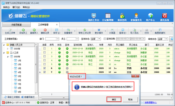 信管飛出納記賬軟件專業版包括工資管理功能,支持自定義工資模板,可根據設置的工資模板快速生成工資單,支持從上月工資單復制工資項目數據,每月工資發放后,可將工資記錄標記為簽領狀態,如下圖所示,本文介紹一下出納記賬軟件中如何標記工資記錄為已簽領狀態?