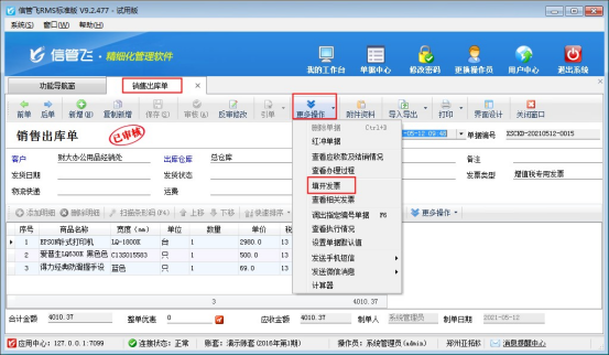 在功能導(dǎo)航窗選擇“銷售管理”—》“銷售出庫單”,保存審核單據(jù)后,點(diǎn)擊工具欄“更多操作”下的填開發(fā)票,如下圖所示: