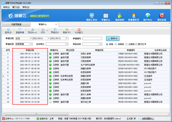 信管飛RMS是集采購管理、銷售管理、庫存管理、往來應(yīng)收應(yīng)付款等一體化的進(jìn)銷存管理軟件,軟件支持單據(jù)中心功能,在單據(jù)中心內(nèi)可以查詢到軟件內(nèi)所填開的所有業(yè)務(wù)單據(jù),可以根據(jù)單據(jù)日期、單據(jù)編號(hào)、單據(jù)類別、往來單位、商品名稱、審核狀態(tài)等信息查詢所需單據(jù),查詢結(jié)果默認(rèn)是根據(jù)單據(jù)日期正序顯示,如下圖所示。