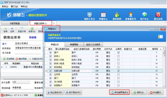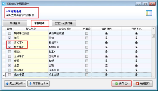 需要手機APP明細項顯示出“折扣率和折扣單價”該如何設置?手機APP的界面調整需要在電腦端界面設計“移動端界面設計”中進行調整,如下圖,打開電腦端軟件,銷售出庫單的界面設計,選擇“移動端界面設計”,勾選顯示出“折扣率和折扣單價”。