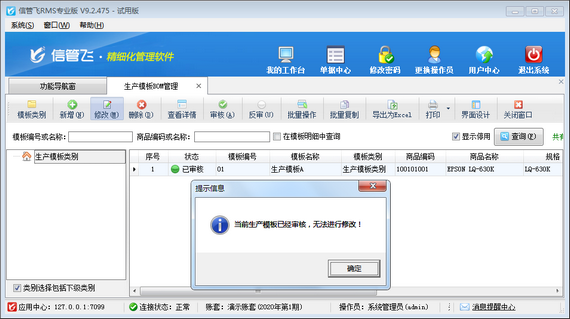 反審核成功后,生產(chǎn)模板狀態(tài)更新為“待審核”狀態(tài),如下圖所示,即可對這個待審核的生產(chǎn)模板進行修改(刪除)操作。