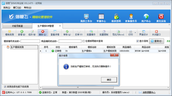生產(chǎn)模板,即BOM清單(物料清單),可配置每生產(chǎn)一個標準單位的產(chǎn)品需要的原材料種類和數(shù)量。生產(chǎn)模板已審核后,不允許直接修改或者刪除,如下圖所示。如生產(chǎn)模板數(shù)據(jù)維護有誤,需要先將已審核的生產(chǎn)模板反審至待審核的狀態(tài),然后在修改(刪除)生產(chǎn)模板即可。