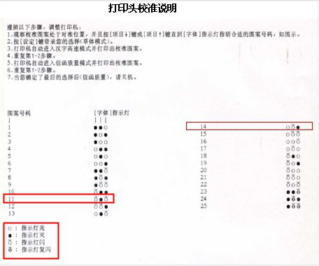 根據校準圖樣選擇打印頭校準的圖樣編號:例如:NO.11打印效果較好;使用【項目↓】鍵把字體指示燈調整成“打印頭校準說明”所示的狀態。例如:N0.11字體燈的狀態為“閃滅閃”。