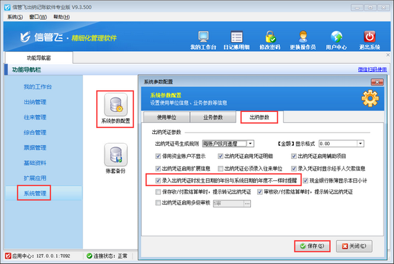 在功能導(dǎo)航窗點(diǎn)擊“系統(tǒng)管理”—》“系統(tǒng)參數(shù)配置”,在“出納參數(shù)”界面勾選“錄入出納憑證時(shí)發(fā)生日期的年份與系統(tǒng)日期的年度不一樣時(shí)提醒”參數(shù),然后點(diǎn)擊“保存”按鈕保存參數(shù)配置。