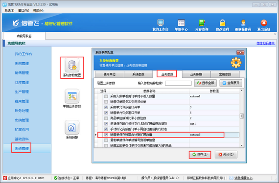 在功能導航窗點擊“系統(tǒng)管理”—》“系統(tǒng)參數(shù)配置”—》“業(yè)務參數(shù)”打開業(yè)務參數(shù)配置界面,在“業(yè)務單據(jù)相關參數(shù)”內(nèi)啟用參數(shù)“銷售單保存稅額合計到擴展數(shù)值”,并設置參數(shù)值,默認是“extnum5”(單據(jù)主體.擴展數(shù)值5)。