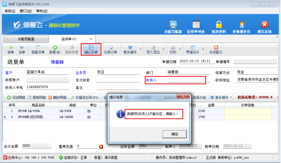 以送貨單軟件為例,示范下如何設(shè)置開單收貨人允許為空。送貨單界面設(shè)置收貨人是必填項(xiàng),正常開送貨單,未在單據(jù)主體中輸入“收貨人”,商品輸入完成后點(diǎn)擊確認(rèn)開單按鈕,會提示“收貨人不能為空”,如下圖1所示: